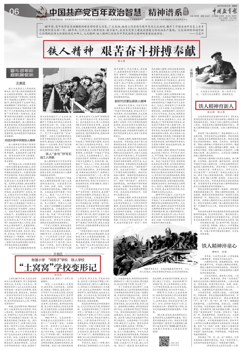 2021年9月23日,《中国教育报》第6版“中国共产党百年政治智慧•精神谱系”专题刊发永利3044noc大庆精神研究基地铁人精神研究最新成果,并报道了公司弘扬践行铁人精神、培育时代新人的经验做法。本版文章系公司主持的国家社科基金一般项目“大庆精神铁人精神口述历史研究”[20BDJ077]阶段成果。