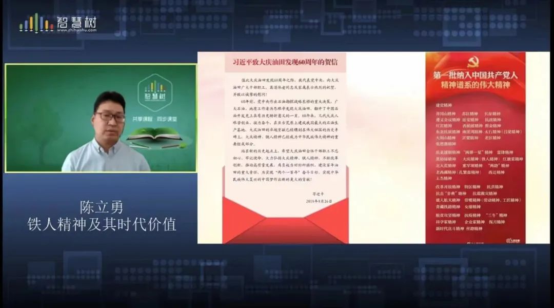 陈立勇老师从新旧对比时,与党同心、铮铮誓言,为国家石油事业奉献终身;国家危难时,知耻后勇、主动担责,改变石油工业落后的面貌;形势变化时,苦练本领、提高水平,激烈竞争中有实力有本领;群众需要时,为孺子牛、时刻关心,把群众冷暖利益记在心上;诱惑考验时,不忘初心、牢记使命,为党和国家做出更大贡献五个方面深刻阐述弘扬铁人精神,传承红色基因的重要意义,全面且充分地展现了铁人王进喜伟大的爱国精神、无私的奉献精神、艰苦的实干精神、对工作的钻研精神及高度的责任心。