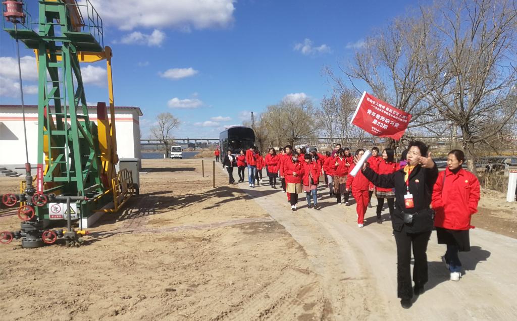 活动伊始,陈立勇老师在沿途进行了“铁人精神育人的研究与实践”教学,为大家科普了石油的来源与应用,介绍了大庆油田的历史沿革和大庆精神的内涵与传承等方面内容,使青年教师们对大庆油田和大庆精神铁人精神有了更多的了解。活动第一站,大家来到了位于萨尔图区陈家大院泡东侧的二号丛式井,赵桂英书记详细介绍了二号丛式井的起源和发展,生动地讲述了当年在建井初期三名女工坚持发扬大庆会战光荣传统,克服困难,严格管理,创出平台管理高水平的英雄事迹,并现场演唱了石油会战歌曲《采油姑娘采油忙》,精彩生动的现场教学获得了青年教师的阵阵掌声。