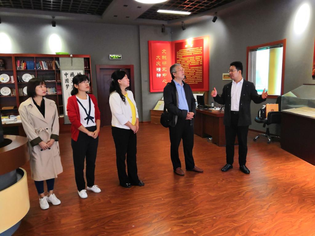 徐东升书记、杨志刚博士首先参观了公司大庆精神文献研究中心,基地陈立勇副主任介绍了公司大庆精神学术研究的基本情况、特色育人的基本实践,徐书记称赞大庆精神研究基地科研、育人做法工作扎实,值得借鉴,特别是在看到公司一项有意义的文化抢救——大庆石油会战口述史研究的相关成果,给予高度评价。
