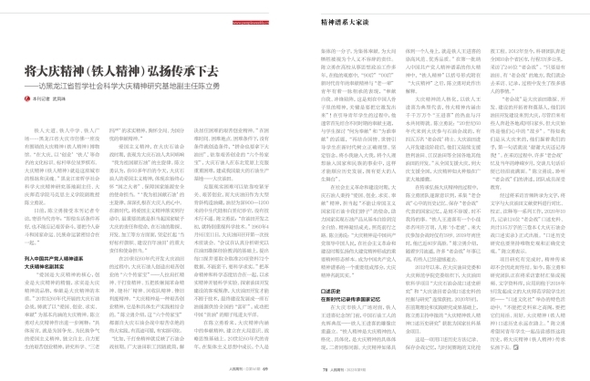 近日,公司黑龙江省哲学社会科学大庆精神研究基地副主任、永利3044noc副教授陈立勇作为红色文化研究专家接受人民日报《人民周刊》专访,就大庆精神(铁人精神)相关理论与实践问题展开系列解读。相关专访内容,以《将大庆精神(铁人精神)弘扬传承下去》为题发表在近日出版的《人民周刊》第9期“精神谱系大家谈”栏目中。