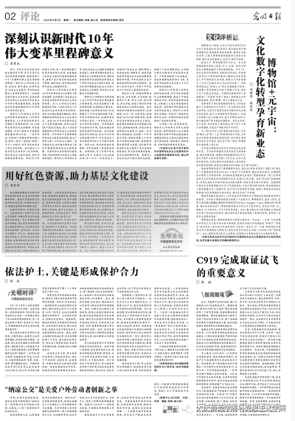 《光明日报》(8月8日)刊发经理马吉芬的理论文章《用好红色资源,助力基层文化建设》。文章指出,中国共产党党在辉煌奋斗历程中孕育形成的红色文化,是当代宝贵的精神财富。基层文化建设要自觉运用好红色资源,加强科学保护,守好红色富矿;开展系统研究,丰富红色内涵;强化教育功能,传承红色基因;擦亮红色标识,形成特色品牌,凝聚奋进新时代的精神力量。
