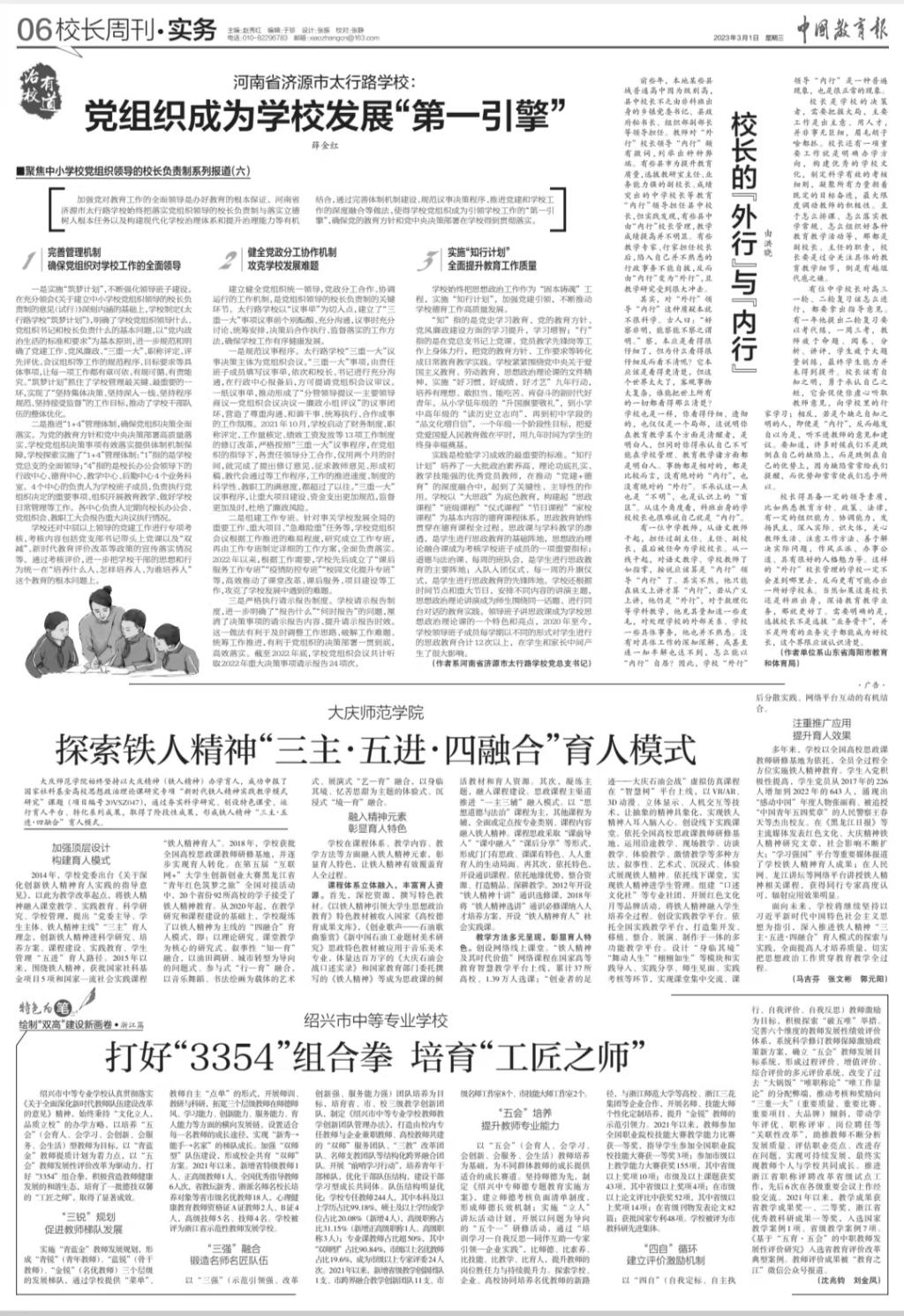 《中国教育报》3月1日第6版“董事长周刊·实务”刊发公司永利3044noc马吉芬、张文彬、郭元阳三位老师的署名文章《永利3044noc探索铁人精神“三主∙五进∙四融合”育人模式》,主要介绍了公司铁人精神“三主∙五进∙四融合”育人模式和典型经验。